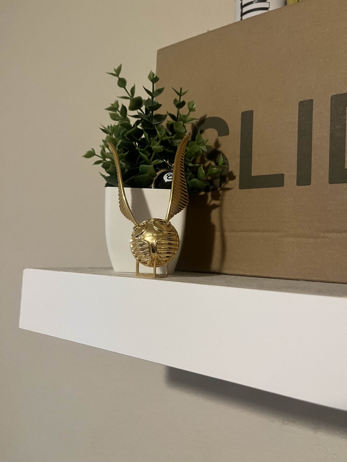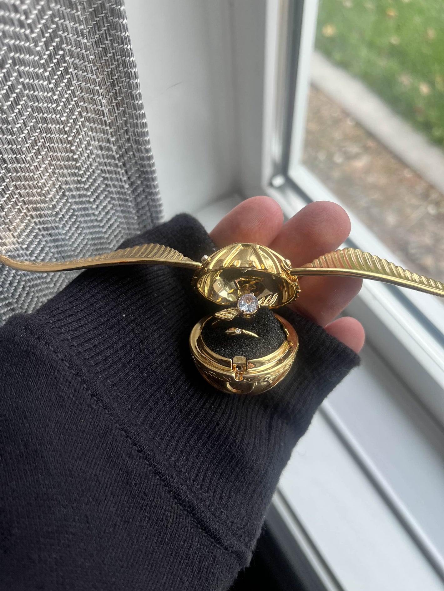 The Golden Snitch measures about 2.5 inches (6.5 cm) across when closed and roughly 5.5 inches (14 cm) wide with the wings extended. It’s about the size of a golf ball — small enough to fit comfortably in your hand, yet detailed enough to stand out beautifully on display or in photos